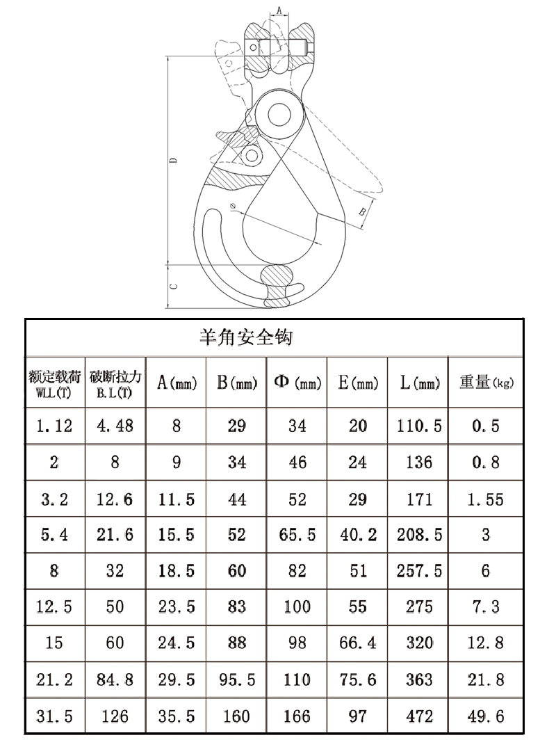 羊角安全钩技术参数: ITEM NO. WLL/T B.L/T A B C D 8-SL1002-06 1.12 4.48 8 29 34 20 95.5 8-SL1002-7/8 2 8 9 34 46 24 121 8-SL1002-10 3.15 12.6 11.5 44 52 29 146 8-SL1002-13 5.4 21.6 15.5 52 65.5 40.2 182 8-SL1002-16 8 32 18.5 60 82
