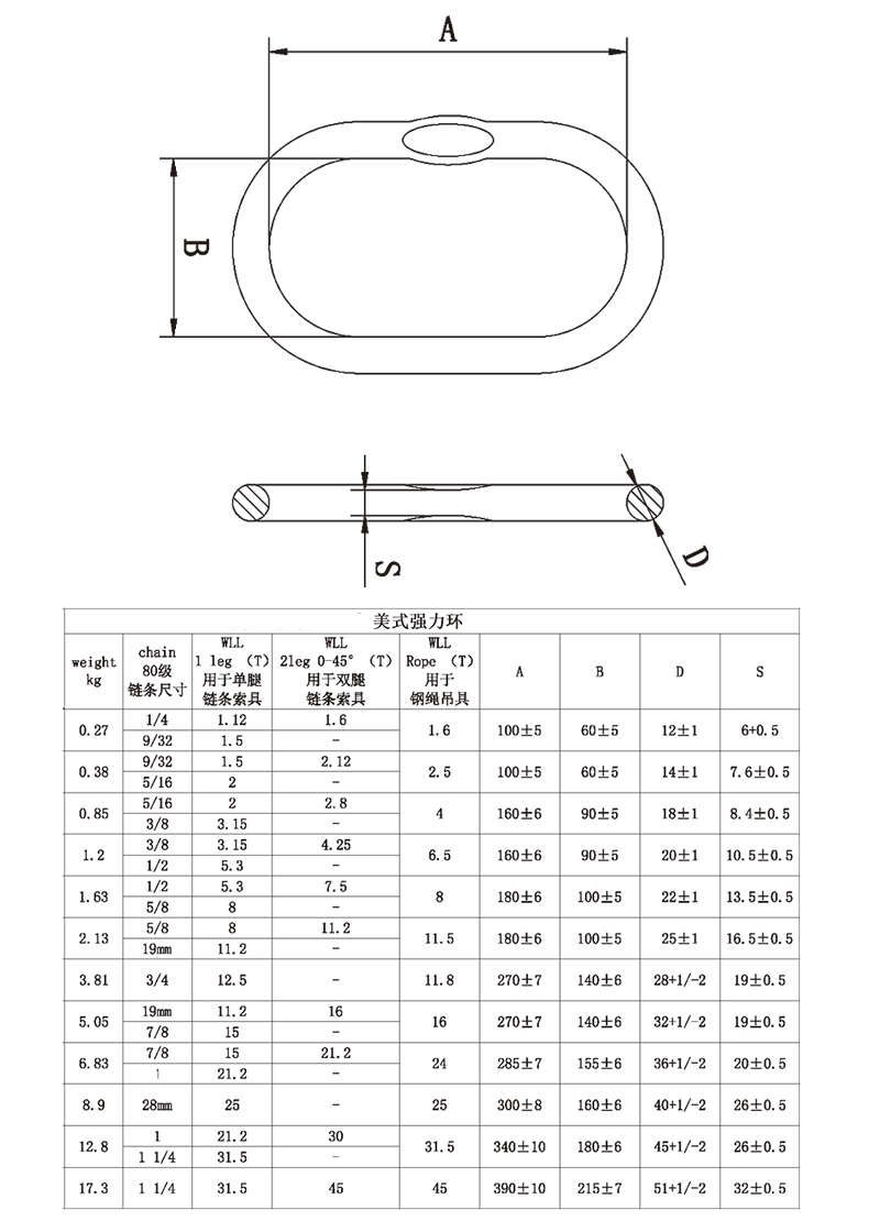 羊角安全钩技术参数: ITEM NO. WLL/T B.L/T A B C D 8-SL1002-06 1.12 4.48 8 29 34 20 95.5 8-SL1002-7/8 2 8 9 34 46 24 121 8-SL1002-10 3.15 12.6 11.5 44 52 29 146 8-SL1002-13 5.4 21.6 15.5 52 65.5 40.2 182 8-SL1002-16 8 32 18.5 60 82