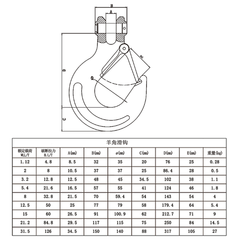 羊角安全钩技术参数: ITEM NO. WLL/T B.L/T A B C D 8-SL1002-06 1.12 4.48 8 29 34 20 95.5 8-SL1002-7/8 2 8 9 34 46 24 121 8-SL1002-10 3.15 12.6 11.5 44 52 29 146 8-SL1002-13 5.4 21.6 15.5 52 65.5 40.2 182 8-SL1002-16 8 32 18.5 60 82
